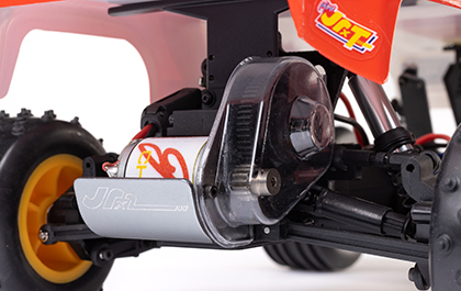 A race-ready Jr's Choice 42-turn motor comes rear-mounted on the Mini JRXT chassis.