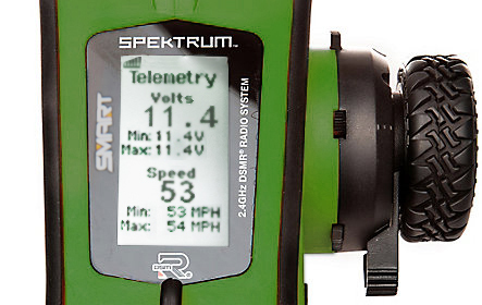 When combined with Spektrum Firma Smart ESCs and Spektrum Smart capable receivers, the DX5 Rugged receives telemetry data right to your transmitter through the Smart Throttle port on the receiver. Smart Throttle ESCs can send RPM, speed, ESC temp, volts and amp draw.